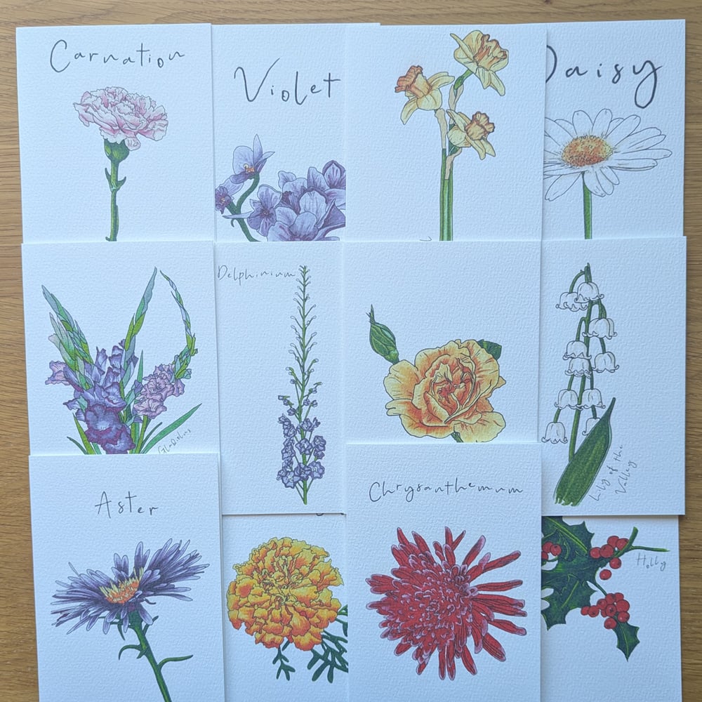 All 12 of the birth month flower cards in a multipack, one for each month.