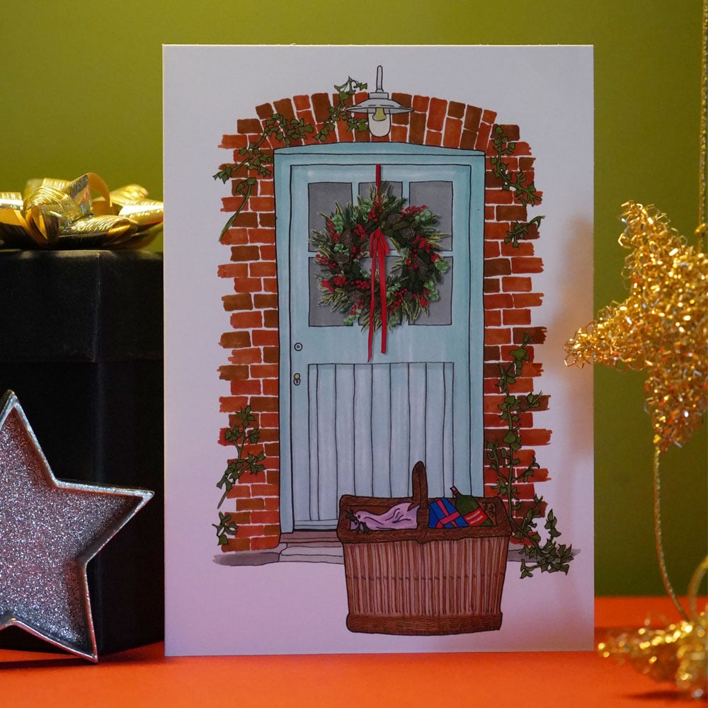 Hand drawn cottage door with wreath design, printed then hand embellished with gold ink for a special touch and a subtle glimmer when moved in light.