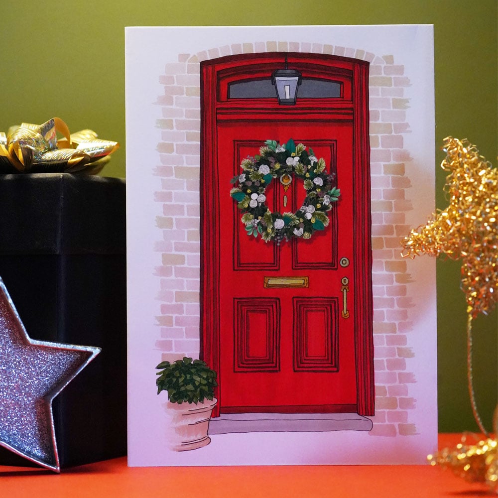 Hand drawn red panelled door with wreath design, printed then hand embellished with gold ink for a special touch and a subtle glimmer when moved in light.