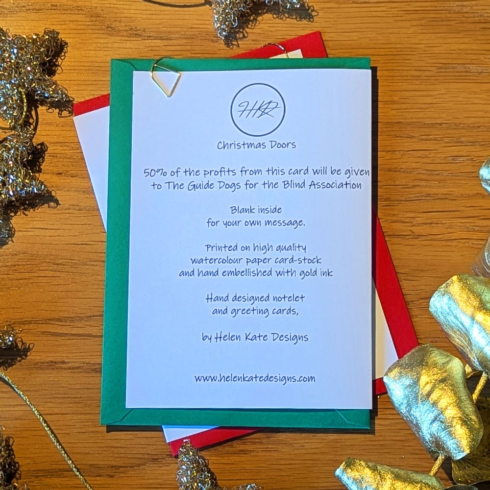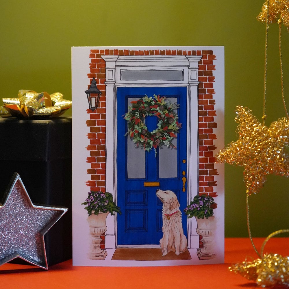 Hand drawn front door with Christmas wreath designs, printed then hand embellished with gold ink for a special touch and a subtle glimmer when moved in light.