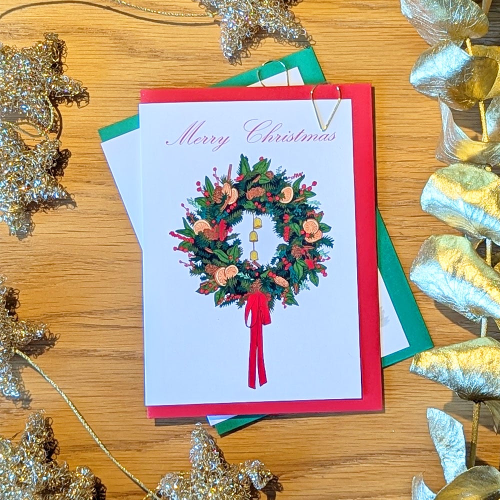 Hand drawn Christmas wreath design, printed then hand embellished with gold ink for a special touch and a subtle glimmer when moved in light.