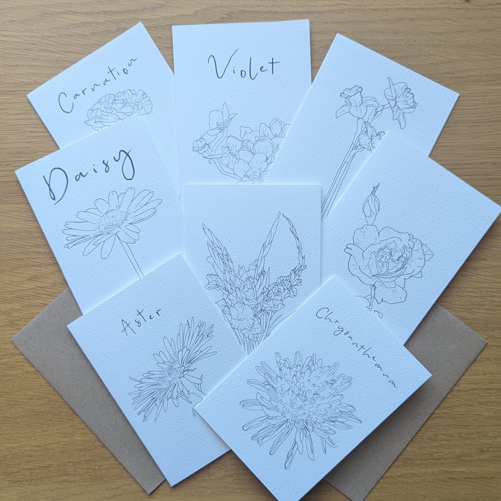 Hand illustrated design printed on white, watercolour, 300gsm card paper-stock for a beautiful painting finish, coloured pencils and pens would also be a beautiful medium.