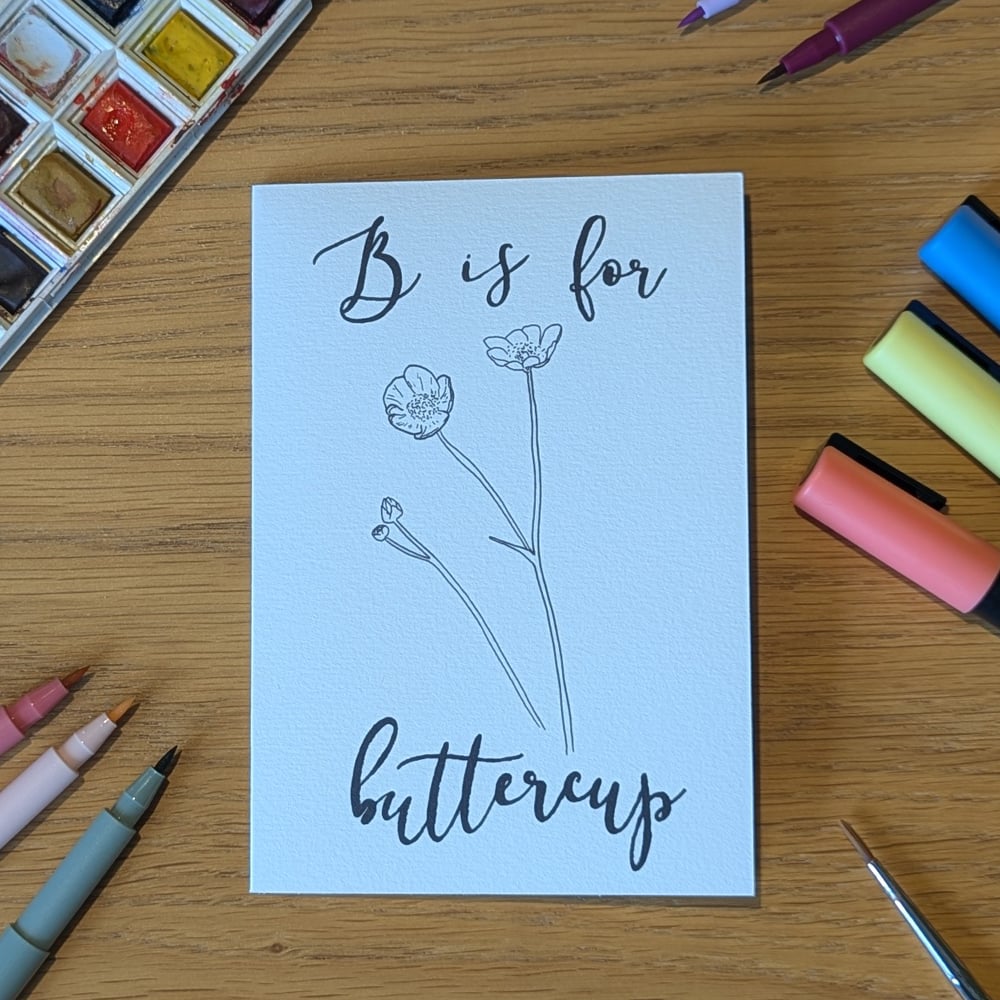 Hand illustrated design printed on white, watercolour, 300gsm card paper-stock for a beautiful textured paint painting finish. Coloured pencils and pens would also be a beautiful medium to use.