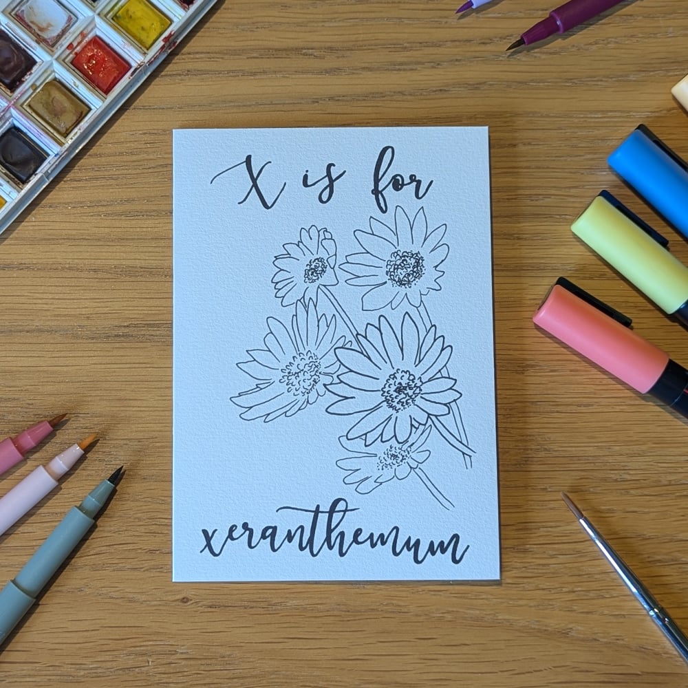 Hand illustrated design printed on white, watercolour, 300gsm card paper-stock for a beautiful textured paint painting finish. Coloured pencils and pens would also be a beautiful medium to use.